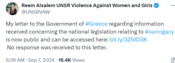 The United Nations Human Rights Council appointed Reem Alsalem as Special Rapporteur on violence against women and girls, its causes and consequences. On July 8, 2024, she publicized her communication to the government of Greece regarding her concerns about “altruistic… Continue Reading →